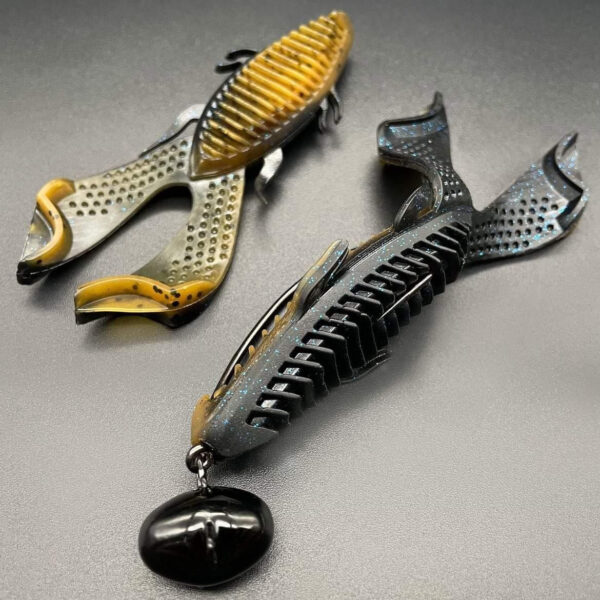 The Bird checked all of the boxes and avoided the issues we have with beaver style baits using a set of made from scratch design choices. A slow tapering, full thickness head gives the hook eye a solid place to sit to avoid head blowouts. The body has a thick core to hold your hook point, fish after fish. Ribs from top to bottom give the fish a soft, inviting consistency to make sure they hold on. Streamline appendages keep your bait falling through cover, no matter the type. The tails attach with a wide base to prevent tear offs. Dimples in the tail promote a subtle swimming action without making the legs paper thin.