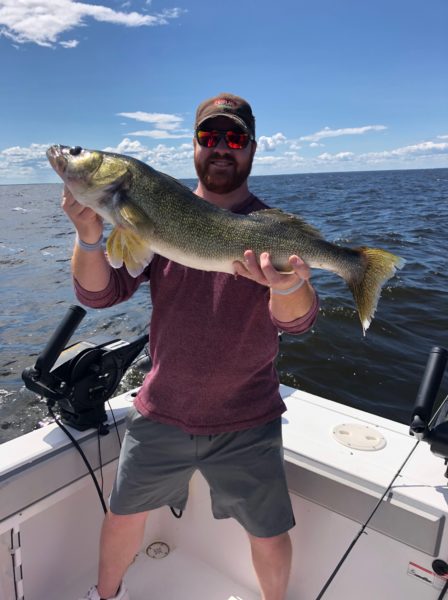 On the south end… The deep summer “Dog Days” patterns for walleyes are in full swing producing excellent fishing. As a rule, the big walleyes are hanging out on the deep mud in 30 – 34′ of water. Two main techniques, drifting or trolling spinners with crawlers or leeches at about 1.0 – 1.25 MPH. Hammered gold, hammered silver and glow white are good starting colors. The second technique is trolling crankbaits through various schools of walleyes over the deep mud. Switch colors often but some starters, pink uv firetiger, chrome / blue, firetiger, and gold. Some walleyes are still being caught shallow based on forage opportunities. Different schools taking advantage of current conditions in different areas. Watch electronics and go fishing!