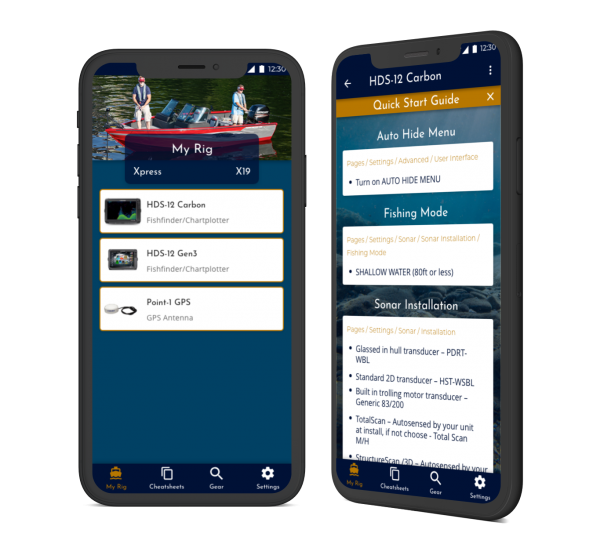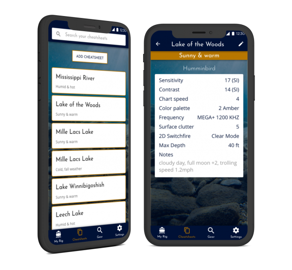 The mobile app makes it convenient for you to retrieve information while on the water, where and when you need it the most. Personalize your own rig with all of your gear. Create an unlimited number of cheatsheet settings for your favorite bodies of water.