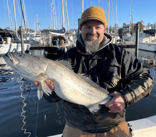Todd Spangler hoists his 12-pound 8-ounce state record seatrout. (Photo by Todd Spangler)