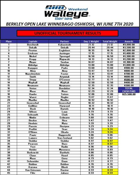 What a great day on Lake Winnebago at the AWWS Berkley Open in Oshkosh, WI. 99 teams took off this morning searching out the win. 1 Came back with $9,000 worth of ‘Bago Walleye, Borcherdt and Kabacinski, Good job guys.. Congratulations to all the top finishers, The weights really increased today. The side pot was 29 teams and we pay it back 100% to the top 3 entered teams as 50/30/20%. The 1st Place side pot worth $1,450.00 went to the 2nd place team of DeKalb/DeKalb. 2nd place side pot went to Peotter and Engelbert and they will share $870. 3rd Place worth $580 goes to Nickel/Sprengel.