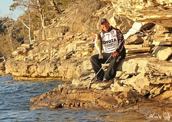 “Anytime you’re struggling to find fish or get a bite, you need to try fishing bluffs,” says Team Toyota’s Terry “Big Show” Scroggins. “Bluffs hold fish twelve months a year, and there aren’t many pieces of bass habitat you can say that about.”