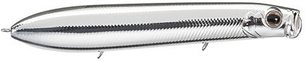 The SB-150’s distinctive design moves water like a subdued popper – splatters, spits, and bubbles – while locomoting in walk-the-dog fashion – a truly novel hybridization. At 5-7/8-inch (150mm) and 1-9/16-ounce (44.5g), the SB-150 sports a trio of nasty #2 trebles, the rear tied with tantalizing feathers, which subtly sway when the bait is paused. The feathered hook also adds resonance in the intervals between stillness and motion and creates suction, connecting with light biters not blasting the surface.