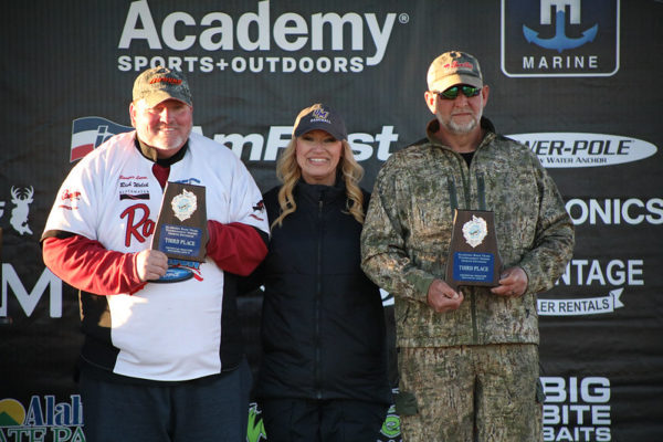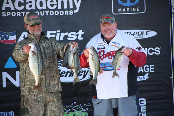 Gregory Lamb and David Powell who took second place with 14.87 pounds shared, “we had a pretty good practice and found an area early Wednesday that had some good largemouth in it, so we left it alone. This morning when we pulled in there, the wind had beat it to death, pushing the fish on the bank. We probably didn’t catch a fish over three feet deep. We are shallow water fishermen. We caught fish on a finesse worm, a square bill and a chatter bait. The area we fished was a little shallow bank with a soft plateau on it. It was full of three- and four-pound largemouth. In practice we made one pass over it and decided this was where we were going to go. Despite the drastic change in air temperature, the water temps were still 57° today just like they were in practice. We were surprised at how well the area held up. We lost a couple of fish that probably could have moved us up, but that’s just how it goes.” They collected a nice $5,000 pay day.