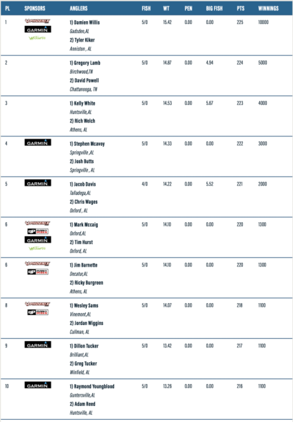 200 of 250 teams checked in to fish, and at the end of the day, 127 Teams had a five fish limit. 185 teams weighed in at least one fish. 40th place had 10.81 pounds and was the last place to get a check of $500. This is one of the reasons why ABT teams are so successful at the next level because even when they face tough conditions, they still come out successful.