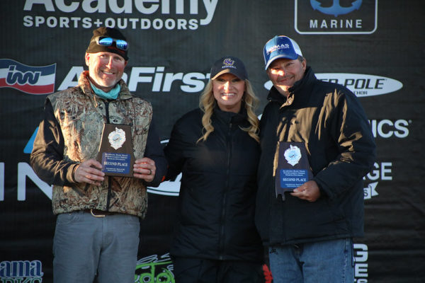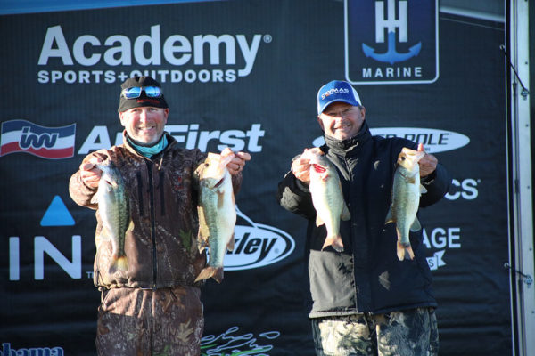 The third-place team of Kelly White and Rich Welch weighed in 14.53 pounds bouncing back after zeroing their first event. They spent three days of practice preparing for this event and planned to start in the back of a creek in the Duncan Bridge area. When they arrived, someone was already fishing that spot, so they decided to scramble and find another area settling on a shallow point with brush and gravel. In this area they used a wacky-rig and shaky head and caught a bunch of 13–16-inch slot limit fish they had to release. They realized there were a lot of fish in the area though. “The colder weather seemed to make the spotted settle down in an area because earlier in the week when the temperatures were warmer, the fish were chasing bait and more spread out. This time of year, you want to be on a north facing shallow clay bank, and that’s exactly where we were today.” They used the forward facing sonar to their advantage and, later in the day, were able to “move off the point a little and see the fish to find there were more fish there than they realized.” They made a couple more moves throughout the day and were able to catch fish each time they moved. Today they mostly caught slot fish and probably caught 15-20 fish from Rock Creek to Duncan Bridge. They caught the biggest fish of the event at 5.67 pounds.