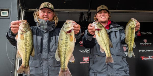 The duo grabbed the early lead on Day One by a slim one-ounce margin and narrowly maintained that lead on Day Two, bringing only four bass to the scale weighing 11 pounds, 14 ounces. Their two-day total of 29 pounds, 7 ounces gives them a mere one-ounce lead over the second-place team from Stephen F. Austin – Austin Anderson of Nacogdoches, Texas and Cal Cameron of Coppell, Texas – who brought a limit to the scale weighing 16 pounds, 6 ounces, to bring their two-day total to 29 pounds, 6 ounces.