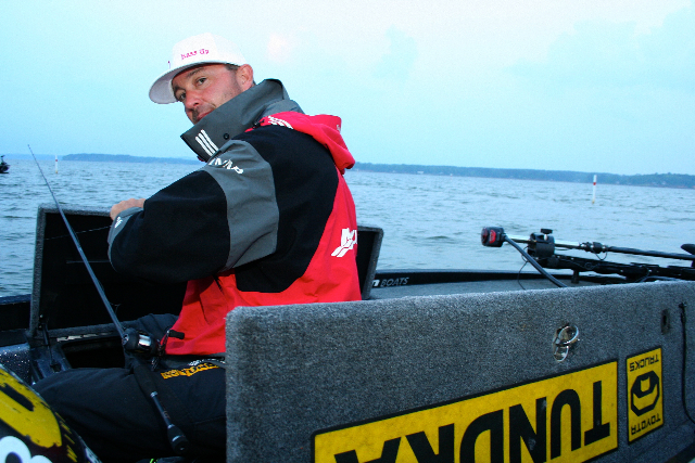 As the sun finally shines, several pros sit stuck and frustrated in an exceptionally slow-moving launch line as anglers with early take-off positions are all ready running down lake to their fishing holes. Near the back of the line, Casey Ashley is not among the frustrated. Instead, the laid-back South Carolina pro with the million-dollar smile and a voice that Nashville is listening to closely sits grinning through the open window of his Toyota Tundra. He’s listening to Kenny Chesney, and the song couldn’t be a better match to Ashley’s beach friendly demeanor. It’s Chesney’s Nowhere to Go, Nowhere to Be. “Nah, I ain’t in no hurry, I’m just goin’ fishin’.” — An outlook that lead Ashley to an awesome 18-pound limit yesterday.