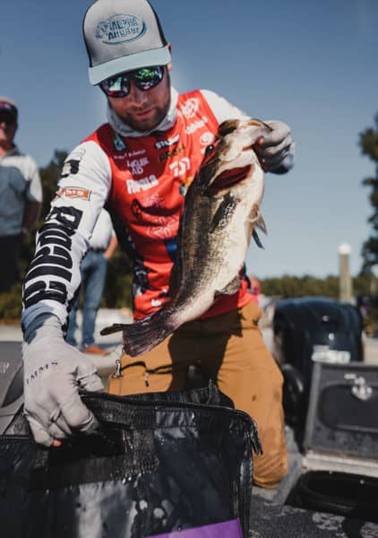“I use braid to fluorocarbon a lot when I am fishing deep milfoil later in the year and pitching that jig and letting it fall through the grass,” he says. “I’ll rig up 50-pound Seaguar Smackdown and use a leader of 20-pound Gold Label.”