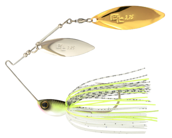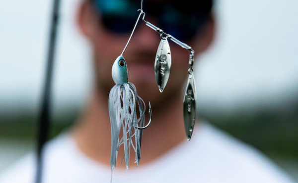 In addition to the different blade combos, Swagy Strong features a hand-tied skirt available in six colors: Black Gold spinnerbaits present twin gold blades, Natural Bait and Pink Smelt patterns feature silver blades, while Chart White, Tidal Killer, and White include a silver leading blade with gold trailer. Both DW and TW blade configurations are available in ⅜ oz and ½ oz.