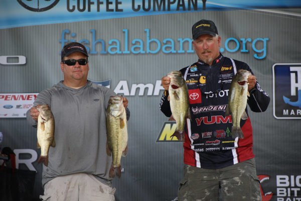 David Par and Jimmy Mason claimed third place with 16.29 and $10,000. “Practice for us was tough and eliminated a lot of water. We had a couple decent periods of fish catching learning the end of the day was a little better than the morning yesterday. Today, we started out upriver then moved down river. Most of our fish were caught swimming a Jig. We ended up catching a few swimming a jig around the grass, but most of them came from swimming a jig around the docks that had the most Mayflies around them. There was a Mayfly hatch everywhere, so a lot of them were around the docks. The water depth was less than five feet, and we noticed when we would swim the jig around the docks, we would bump laydowns and bunches of bluegills would come up. We started out swimming a BOOYAH Mobster Swim Jig in white but didn’t get very many bites on it. When we made the switch to the black and blue jig and green pumpkin jig, that made the difference for us. We matched up with a YUM Spine Craw Trailer.” The team is really looking forward to the final stop at Pickwick Lake and expect there to be some really good fishing the final event.