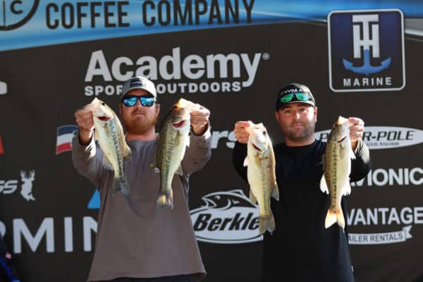 Mike and Slade both live on Lake Martin and have spent many years learning how to fish the conditions. They relied heavily on experience to narrow down the pattern. Their plan after practice was to “spend the day sight fishing. We located an area in practice holding a few pre-spawn fish including one female around 4-pounds. When we arrived on that spot, we noticed the female was not there but spent some time looking for her. She never showed up, so we caught the buck bass off the bed and continued fishing the area using a Wacky Rigged Senko on 15lb Fluorocarbon line and a Zoom watermelon Speed Craw on a ¼ oz ball jig head and 12lb test line.” They decided to abandon the area and look for similar areas and “ran all over the lake looking for more of the same style pattern.” The other areas did not produce the quality of fish they were looking for. “We know it typically takes mixed bag of largemouth paired with a couple spotted bass over 2-pounds to win here, so that was what we went looking for. The spotted bass we were catching were all under 2-pounds, so we decided to go back to our original area for the rest of the day.” They ended up weighing in a limit of all largemouth. Throughout the day they caught 20 fish, and only 5 of those were spotted bass. Their limit weighed 14.57 giving them a $10,000 payday from this event.
