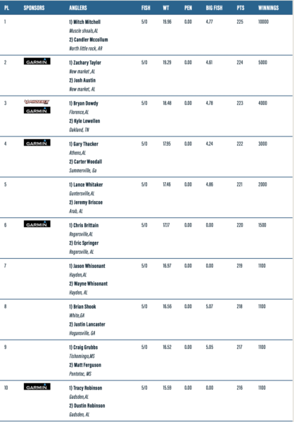 The Top 10 places are below for a complete list of standings visit: https://www.alabamabasstrail.org/weiss-lake/results/