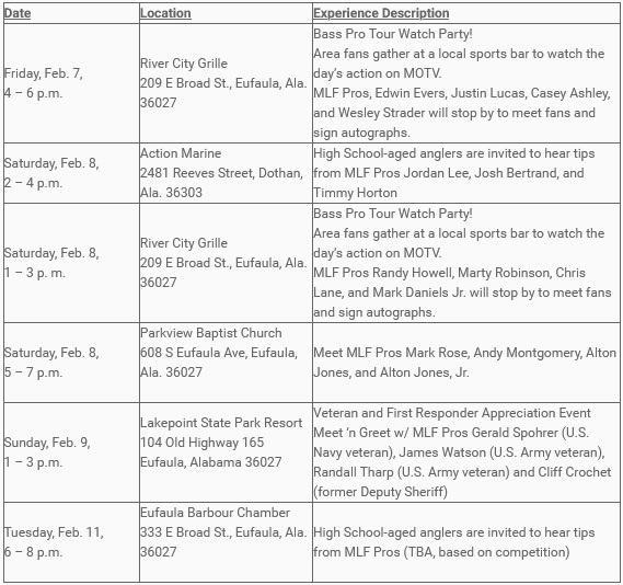 MLF Pros love meeting their fans! Accredited members of the Media are invited to cover these MLF Pro Anglers meet-n-greets / appearances at the following locations with advance coordination: