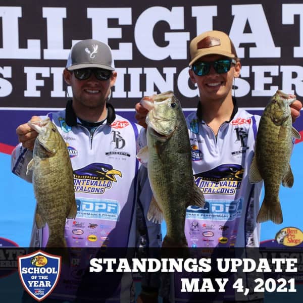 SAN ANTONIO, TX (May 4, 2021) – The race for the 2020-21 Bass Pro Shops School of the Year presented by Abu Garcia enters the final stretch of the season as the calendar has now flipped over to the month of May. With just three weeks remaining before a winner is crowned following the completion of the BoatUS Collegiate Bass Fishing Championship presented by Bass Pro Shops on May 27th, the conclusion of the season is setting up to provide a historic conclusion. The University of Montevallo has held on to the top spot in the rankings for going on seven months now as the team has amassed a total of 16,240 points. McKendree University, seeking its third straight title, is in second, and Murray State sits in third as the team is hoping to win its first title as well.