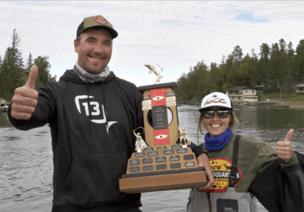 Jamie Bruce and his wife Ashley hoist the 2021 Bassin for Bucks trophy.