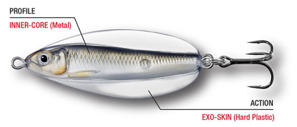 One of the most significant advantages of ICT is the ratio of plastic between the Inner-Core and Exo-Skin. The Inner-Core is much smaller than the overall mass of the entire lure. That means anglers can present a smaller hatch size while retaining the advantages of throwing a bigger bait. The Exo-Skin’s clear plastic adds 30% more mass, which adds more turbulence in the water.