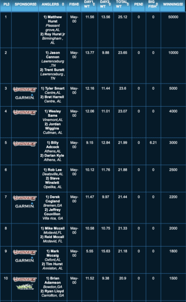 The top ten standings are below for a complete list see: https://www.alabamabasstrail.org/tournament-series/lsl-results/