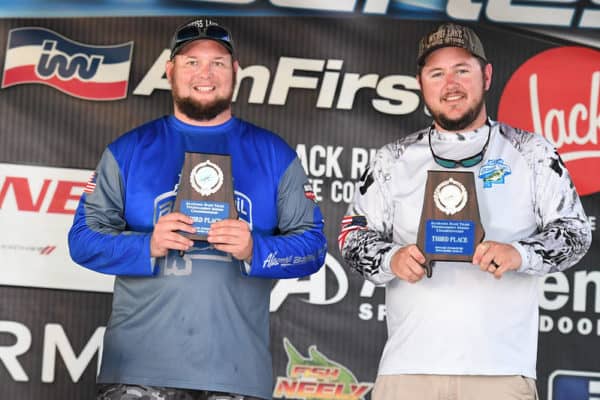 The 3rd place team of Tyler Smart and Bret Harrell had a two-day total of 23.60 and took home $5,000. They were in 6th place after day one with 12.16 pounds and spent their time in Rock Creek targeting fish in pockets early in the morning using a buzzbait, a River2Sea Rover in a shad color and a Whopper Plopper. In the afternoons, they would work their way back out towards the main creek channel using a homemade shaky head with a green pumpkin Zoom Trick Worm. They felt the key for them was targeting fish in the shade using the topwater. On day two they ran the same pattern but found the shaky head bite really went away, so they went back to the pockets and caught a few more fish using the River2Sea Rover. “The wind really changed today and blew from a direction that hurt us. When you are throwing a 3/8 oz weight, it’s hard to feel the bite in the wind.”