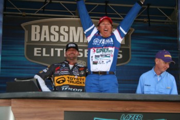 Minutes earlier Swindle described the details of his outstanding week to the media. “I was primarily fishing a jerkbait on 12-pound Vicious line with a 6.3:1 Quantum Smoke reel and a 7-foot medium action Smoke Rod. I made repeated casts into points with enough of a curved bend in them to catch the wind. If the wind was blowing across or over the point, it wasn’t nearly as good. I’d sit out there and make repeated long casts at those points that the wind was blowing into, and if there was a drop in depth in the wind blown bend of those points — that’s where I’d get bit,” explained Swindle.