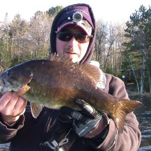 OFM’s Keith Worrall with a bonus Small Mouth Bass he caught on a GULP 4" Crawler while fishing a small Northern Wisconsin Lake right at ice out for walleyes.