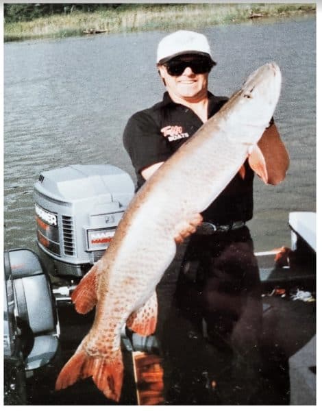 In 1985, (now Dr.) Bernard Lebeau began the fieldwork for his doctoral thesis under the guidance of his Professor at the University of Toronto, then Curator of the Royal Ontario Museum and renowned world muskellunge authority, the late Dr. Ed Crossman. This work was funded for the most part by the Ontario Ministry of Natural Resources, with help from Muskie’s, Inc. Chapters purchasing over $5,000.00 worth of transmitters, and served to do much needed research work on Wabigoon and Eagle Lakes. I bring this forth because during the spring netting work on Wabigoon Lake Bernard captured in one of his nets, a muskellunge of mammoth and possible world record proportions!
