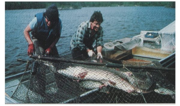 The Holidayer news covered this event on August 2, 1985 in an article by Jim Poling Jr. entitled “Research aims to help muskie’s future”. In that article was a photograph of Bernard and his assistant Marko, pulling a net that contained the huge fish. That photo caption stated “HUSKY HAUL” – Bernard Lebeau (right) and a fellow biologist haul in a seine net (actually a trap net) with a monster muskie trapped inside”…