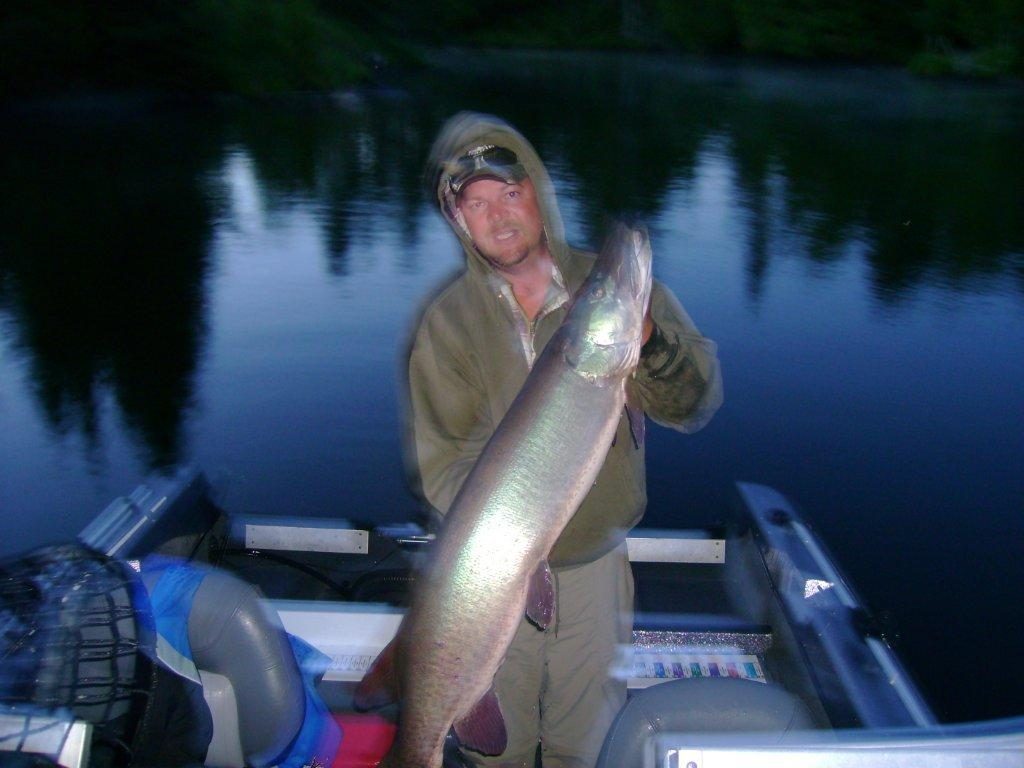 On our annual trip to Ontario I caught this huge 48 inch Musky the 2nd morning. My net and camera partner had some difficulties that morning as he missed the fish the 1st time at the boat and as you can see in the picture he did not hold very still waiting for the flash. By the way, the hood is to keep the mosquitos away, not for the cold. _x000D_ _x000D_ P.S. Even with his difficulties this year I would still not trade him for any other fishing partner:)