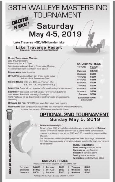 The 38th Walleye Masters Inc Tournament will be held May 4-5 on Traverse Lake a South Dakota and Minnesota Border Lake.