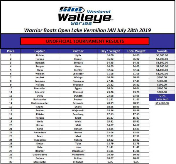 AWWS Warrior Boats Open on Lake Vermilion in MN top 5! This was the 4th and final stop for MN – next up: State Championship on Lake Bemidji! 1st place finishers showed up to fish today and smoked ’em with a tough bite!! Chaz Dobias and Ryan Hylla found the GOLD and brought in a bag of 44.00 pounds!! Way to bring it home!! Your 2nd place finishers are father and son team of Bjorn and Rodney Horgen!! They had a hefty bag with 36.92 pounds!! Way to go, fellas! Your 3rd place finishers are no strangers to the stage – another father and son duo, Team Bonsack! They brought in 34.38 pounds!! Nice work!! Your 4th place finishers keep showing up and keep finding themselves at the top!! Randy Topper and Chuck Hasse had a bag with 34.09 pounds!!! Your 5th place finishers had a dandy of a bag! Mike Klein and Allen Kichler had 32.64 pounds of Vermillion Gold!! Nice job!!