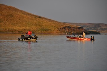 The morning broke clear and cool, but the rising sun brought a promise of 98 degrees and winds forecast to be light but enough to put a decent chop on the waters of Lake Oahe. The Pros were looking forward to a long ride of anywhere from 40 miles to as much as 65 miles south to the Cheyenne and a great bite if the fish hold. 50 Pros and Co Anglers left the Swan Creek launch at 7:30 this morning.