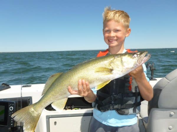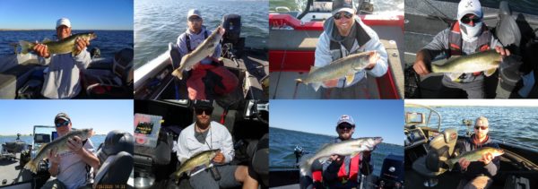 “Wham, the 25-incher hit,” Ellingson said. “I could see boulders at the bow and at the back it was 11 feet. The next four fish were at the next rock spot along the shore. Including a 26, a 16 and a 20-incher. I re-tied rigs 25 times yesterday. We were right in the rocks and the fish were right in them. We went to another point and caught a 27 and a 23 in the mud streaks. The fish were right under them. We lost a couple of others too. Everyone else near us was fishing in 30 feet of water. We were the only boat up in the rocks.”