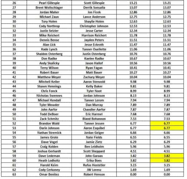 In third place and collecting $2,000 for 31.04 pounds were Matt Ristow and Kyle Hertz, both from Bismarck. They also took home an extra $740 side pot cash for being third in that as well.