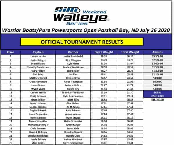 The “Arm,” as in, Van Hook, was again the place to be for big fish on Lake Sakakawea for winners Lonnie Jacobs and Janine Landsiedel, who had two spots zeroed in and chose their “Number Two” location to land 36.33 pounds, taking the AIM Weekend Walleye Series/Pure Powersports Open on Sunday, July 26.