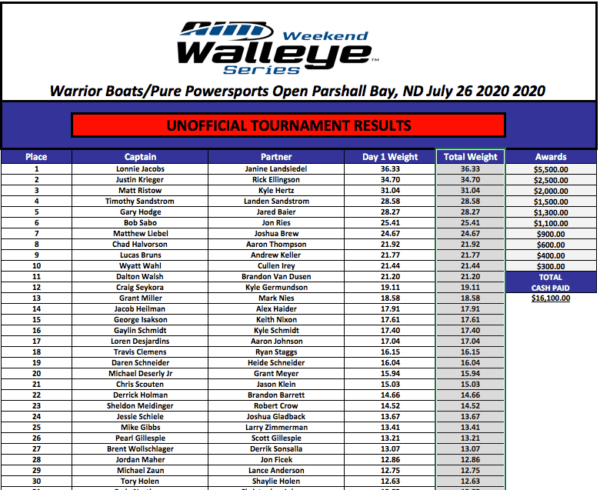 The AWWS Warrior Boats/Pure Powersports Open on Lake Sakakawea at Parshall Bay, ND unofficial results are in! Congrats to Lonnie Jacobs & Janine Lanseidel on their 1st place win! Justin Kreiger & Rick Ellingson snagged a 2nd place win! These 2 teams will be interviewed on The Rap on Tuesday night.