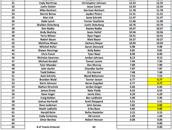 There was also a side pot that 37 teams entered into at $100 each. The winners in 1st place was the 1st place team of Jacobs & Landseidel and they win $1850. In 2nd place was the 2nd place team of Kreiger & Ellingson and they will pocket $1110. 3rd place is the 3rd place team of Ristow & Hertz and they will take home an extra $740.