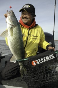 Ted Takasaki with a monster walleye caught while anchored in a prime spot on the Winnipeg River. The fish fell for a Lindy X-Change jig tipped with a frozen shiner