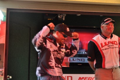When Robert Blosser came to the AIM stage after Day Three with a whopping 34.58 pounds he vaulted into the lead, and waited patiently in the “Hot Seat” for the last two anglers to weigh in. The first place curse caught up to Dennis Gulau, who struggled to bring in 18.57 pounds. The pressure was on Brett King, but he was up to the challenge and electrified the crowd with another big limit weighing 31.14 pounds.