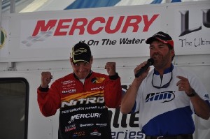 Minot, North Dakota’s Jim Carroll said in his early day one interview he was swinging for the fence. He went out to the ‘big blue’ today, and fished ALL day for two fish. That might not have been something to talk about if the ‘two fish’ he caught hadn’t converted from 30″ and 30.75″ to a weight 23.58 pounds, enough for a 1.32 pound lead over second place Rich Boggs hailing from Nisswa, MN, who brought a solid limit of seven in today converting to 22.26.