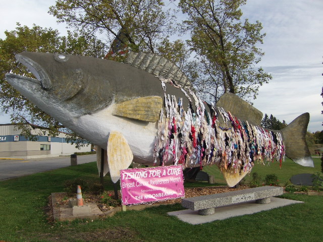 | October is Breast Cancer Awareness Month. A local group, the Moonbeams, organized the decorating of Willie Walleye in Baudette with bras, raising the awareness of breast cancer. |