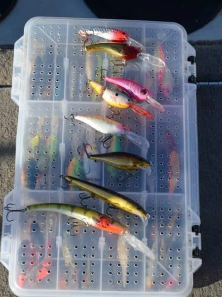 My go-to colors are gold, blue/chrome, pink and UV pink, firetiger and black. Yes, black. By raising the black crank up a bit, walleyes see that dark silhouette against the sunlight above. Just like night fishing, dark-colored lures can rule against the shine of the moon.