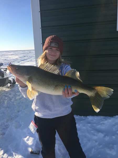 On the main basin… Good numbers of walleyes and saugers being caught of all sizes. Jig one line, deadstick second. Most anglers focused in 25-31′ of water. During the morning and evenings, shallow water bite in 13-18′. Electronics very helpful with some larger fish suspended. Every resort ice road is different but pickups and wheel houses of varying sizes allowed on various ice roads. Gold, glow red, yellow and orange hot colors. Ice ranges from 12-20″ where resorts are fishing. Snowmobile trails on lake staked from south shore up to NW angle. Please stay on marked trails, don’t go off on your own and exercise safety precautions as ice conditions vary.