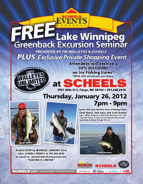 Following the seminar Chad, Scott and Kyle will offer hands on help locating the correct equipment in the Scheels fishing department. These guys have worked with Scheels to make sure the proper items are in stock and also arranged for attendees to receive 20% off all ice fishing lures purchased that night with a minimum $50 purchase.