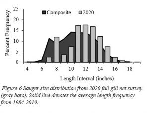 Sauger grow at a much slower rate than Walleye, do not get as large as Walleye, and do not get as old. Typical lengths for Sauger sampled during the fall assessment are 6 inches for age- 1, 8 inches for age-2, 10 inches for age-3 and 12 inches long for age-4 (Figure 6). The largest Sauger we sampled in 2020 was a 18 inch long female that was 11 years old.