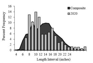 Small Walleye, from 8 to 11 inches long, are abundant; a possible indication of an upcoming strong year-classes (2018 & 2019). Harvestable-sized Walleye were below the historic average for nearly all length categories (Figure 3). High harvest documented in 2019 and weak to average year-classes produced from 2015-2017 likely account for this distribution.