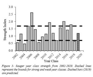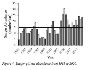 Sauger outlook. The Sauger population remains at a high level of abundance, at 23 Sauger per gill net lift in 2020 and is above the recent near-shore average of 2002 – 2019 (19/net; Figure 4). Sauger abundance was highest in 2008-10, primarily as a result of the strong year class produced in 2006.
