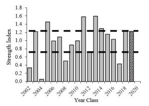 Figure 2 – Walleye year class strength from 2002-2019. Dashed lines represent the bounds for strong and weak year classes. Dashed bars (2019) are predicted.