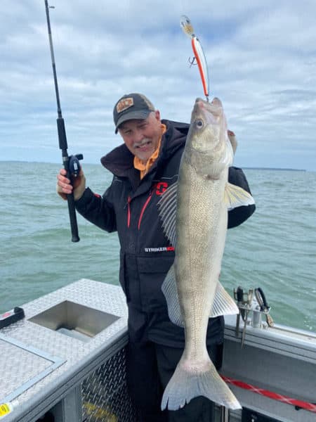 In this picture the author has just landed a nice walleye on a prototype version of the Precise Walleye Crankbait. Notice the unpainted bill on this digital 3D printed prototype. Finished baits will feature vacuum metallized chrome and gold finishes designed to maximize flash.