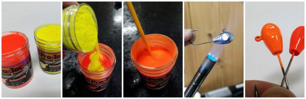 Pro Tec Powder Paint is my go to and when I need to paint jigs fast I’ve found this to be my preferred method to paint my jigs in most situations. Pro-Tec offers a variety of great fish catching colors and one of my favorite things to do is to mix them to make my own custom blends. By simply taking a couple of 2oz jars of Pro-Tec and taking a quick look at a color wheel you can make almost any color you can imagine. My good friend Brad Bull first introduced me to this concept when he was describing to me some custom blades he’d been making for tying up spinner harnesses. It was a custom blend of pumpkin powder paint he’d created by taking Blaze Orange and Yellow Chartreuse in equal parts. You can do this with most any of the powders Do-It offers. Equal parts of black and white will easily achieve a grey (shad like) color that is killer in the fall. There are endless combinations of blends that can be created by mixing paints. On certain days these small variations on colors can make a huge difference between getting bit and not getting bit.
