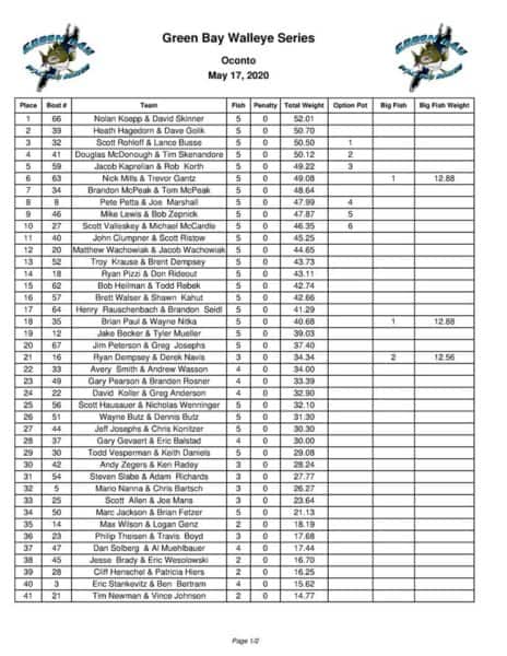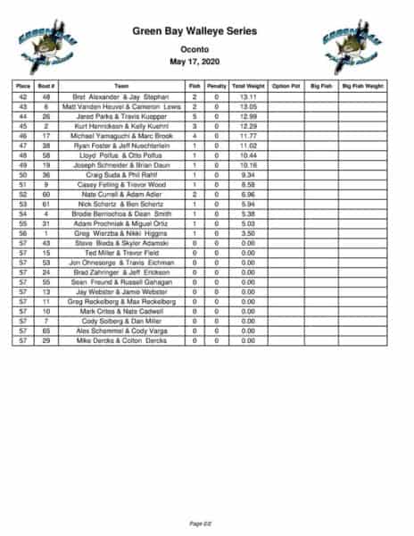Here are the full unofficial results from the May 17th GBWS tournament. Congratuations to Nolan Koepp and Dave Skinner on the win. With 4 teams over 50 lbs, there was some great competition out there.